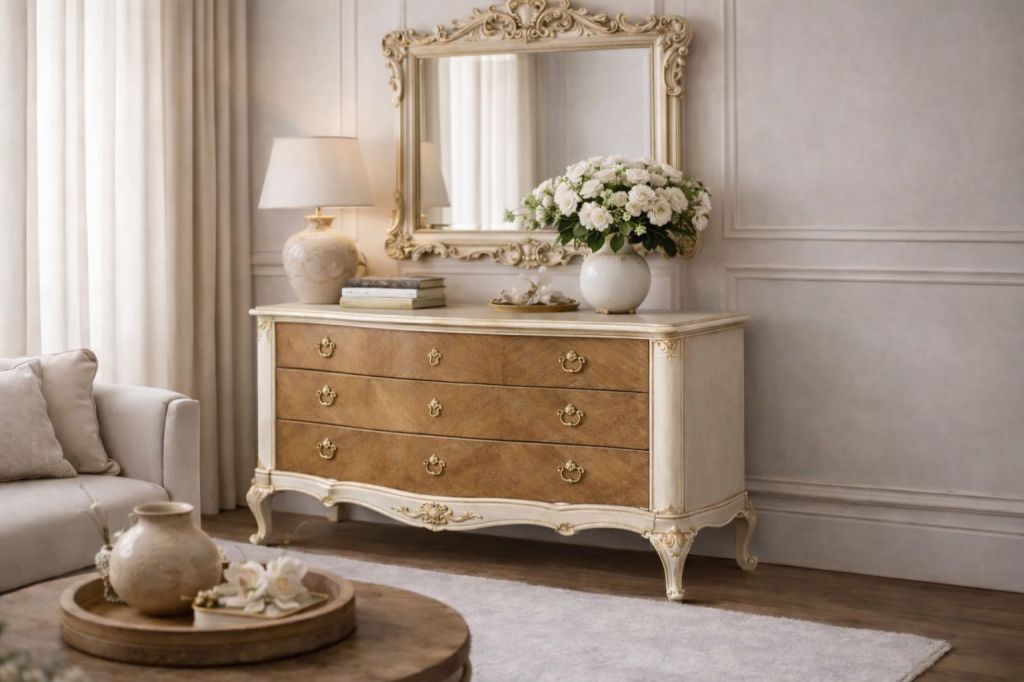 Serha è una cassettiera dal carattere femminile e luminoso, con linee antiche e proporzioni equilibrate.