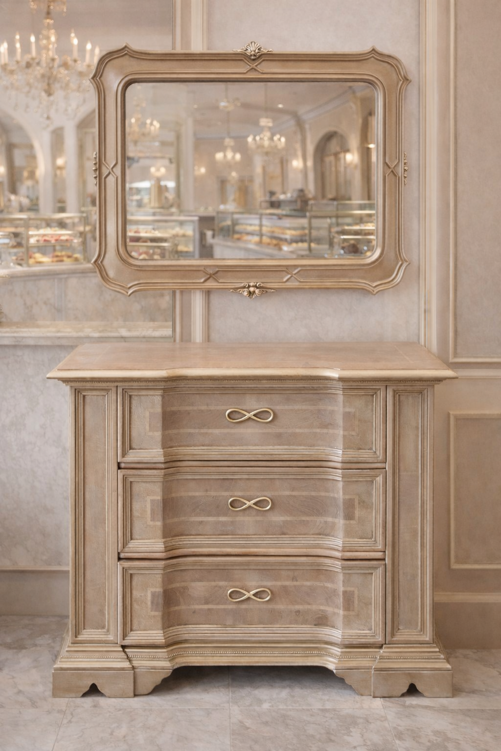 Il comò è abbinato allo specchio originale, formando un insieme armonioso e luminoso, capace di trasmettere equilibrio e pace, in dialogo con ambienti classici e contemporanei.