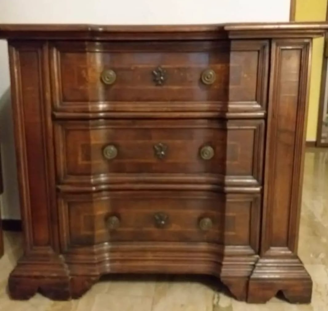 Comò originale italiano di fine Ottocento / primo Novecento (ca. 1890–1915), lavorato interamente a mano e riportato al legno vivo attraverso un accurato restauro conservativo. Le impiallacciature decorative originali sono oggi nuovamente leggibili grazie a una schiaritura controllata, una leggera velatura chiarissima e finitura a cera tradizionale , che ne preservano la matericità e il disegno naturale.